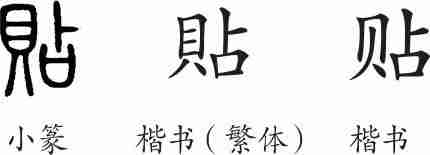 “贴”是形声字。小篆从貝,占声。隶变后楷书写作“貼”。汉字简化后写作“贴”。