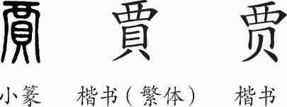 “贾”是会意兼形声字。小篆从貝,从襾(yà,表蒙覆),会将货物蒙覆存放之意,襾兼表声。隶变后楷书写作“賈”。汉字简化后写作“贾”。