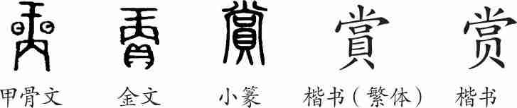 《说文·貝部》:“賞,赐有功也。从貝,尚声。”(賞,奖赐有功的人。从貝,尚声。)