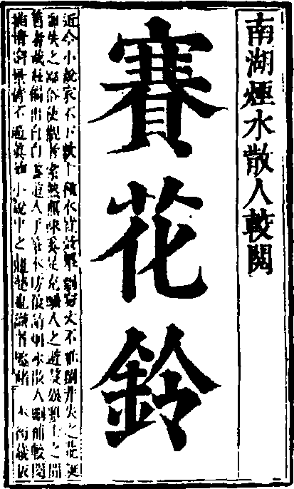 清代白话长篇才子佳人小说。全称《赛花铃小说》。十六回。题“吴兴白云道人编本,南湖烟水散人较阅”。白云道人真实姓名无考,烟水散人即徐震。徐震,字秋涛,浙江嘉兴人。成书于清康熙元年(1662)。