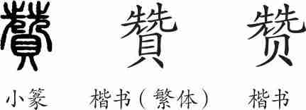“赞”为会意兼形声字。小篆从貝,从兟,会导宾之人接过客人的礼物捧着引见给主人之意,兟兼表声。隶变后楷书写作“贊”。汉字简化后写作“赞”。