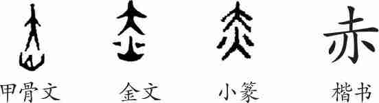 “赤”是会意字。甲骨文从人,从火,会火映红了人之意。金文、小篆与甲骨文形体相似。隶变后楷书写作“赤”。