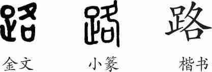 “路”是会意兼形声字。金文从足,从各(表示到来)兼表声。小篆承接金文。隶变后楷书写作“路”。