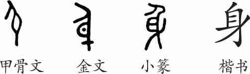 “身”是象形字。甲骨文、金文、小篆都像一个大肚子的侧面人形,是一个怀孕的女子的样子。隶变后楷书写作“身”。
