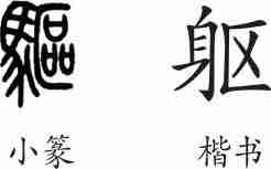 “躯”是形声字。小篆从身,區声。隶变后楷书写作“軀”。汉字简化后写作“躯”。