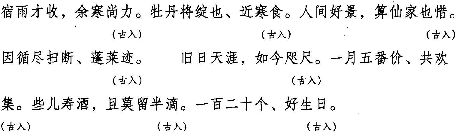 注:本词例押古入声“质” “陌” “锡” “职” “缉”韵。因“陌” “锡” “职”“缉” 在古韵中与“碧” “的” “力” “立” 同韵,而“碧” “的” “力”“立”在现代韵中属“衣”韵,故“陌” “锡” “职” “缉” 可押“衣”韵; 而“质”在现代韵中属“衣”韵,故全调可押衣部“衣” 韵。