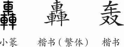 “轰”是会意字。小篆从三“車”,会群车过处轰然作响之意。隶变后楷书写作“轟”。汉字简化后写作“轰”。
