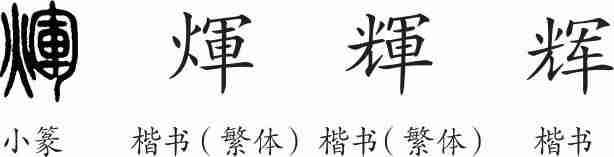 “辉”是形声字。小篆从火,車声。隶变后楷书写作“煇”。俗作“輝”,改为从光。汉字简化后写作“辉”。