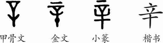 “辛”是象形字。甲骨文像一把平头刑刀。金文大体上与甲骨文形体相同,上部加上一横,表示铲割的东西。小篆承接金文而来。隶变后楷书写作“辛”。