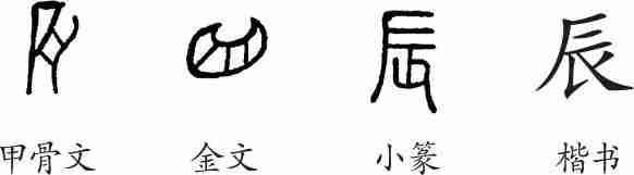 “辰”为象形字。甲骨文像蚌壳之形。金文更加形象。小篆的写法与甲骨文的形体类似。隶变后楷书写作“辰”。