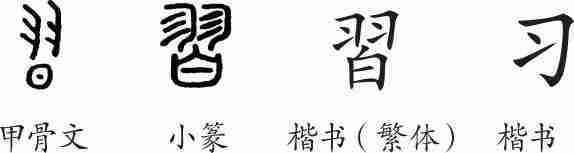 “习”是会意字。甲骨文从羽,从日,会鸟儿在日光下练习飞翔之意。小篆中,“日”字误变为“白”字。隶变后楷书写作“習”。汉字简化后写作“习”。
