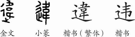 “违”是会意兼形声字。金文从辵(辶)从韋(相背)会意,表示背离,韋兼表声。小篆整齐化。隶变后楷书写作“違”。汉字简化后写作“违”。