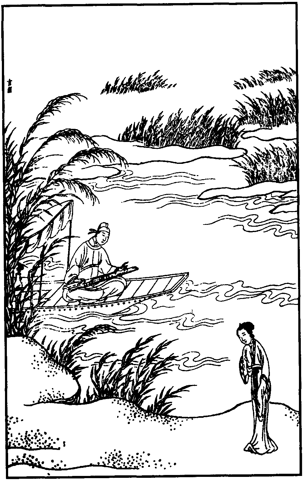 《倩女离魂》 第二折写王文举走后,深切的爱使倩女思念成疾,她的魂魄脱离躯体赶上王文举一同进京。因至情而魂离躯体,是新奇而大胆的情节,使倩女的形象具有了浓厚的浪漫主义色彩。这里所选的六支曲子是倩女离魂追赶王生时的唱词。文词以抒情见长,既有倩女离魂追赶王生的急切神态的传神描写,也有倩女离魂担惊受怕心理的细腻刻划,还有萧疏清朗的江上夜色的精彩铺叙,文情并茂,情景交融,历来为人所激赏。