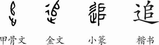 “追”是会意兼形声字。甲骨文从止(脚),从弓,会持弓追击之意。金文又加上一条道路(彳),追击之意更为明显,从辵从会意,兼表声。小篆整齐化。隶变后楷书写作“追”。