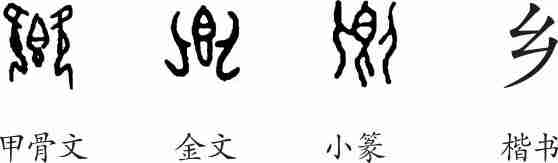 “乡”是会意字。甲骨文像两个人对着盛有食物的器皿,会两人相对而食之意。金文、小篆整齐化。隶变后楷书写作“乡”。