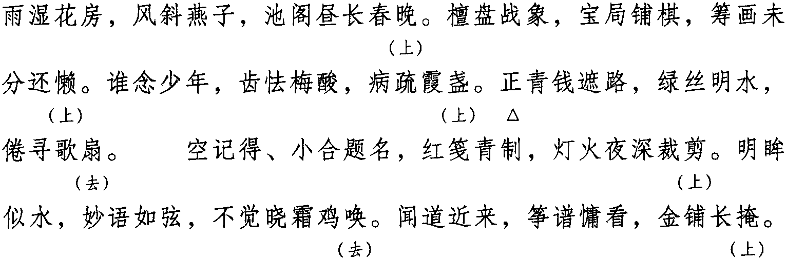 本格双片一百零七字。全词同韵,仄韵,韵字可上声、可去声。上下片第十句首字为领字。另有一百一十一字。其上下片第七句、第八句、第九句韵段内各加两个字; 或其他韵段内可撤句造句,但须保持其字数不变,见曹勋、刘埙等词。本词又名 《选官子》 《转调选冠子》 《惜余春慢》 《苏武慢》 《仄韵过秦楼》。