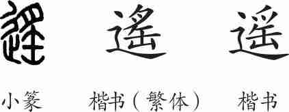 “遥”是形声字。小篆从辵,声。隶变后楷书写作“遙”。汉字简化后写作“遥”。