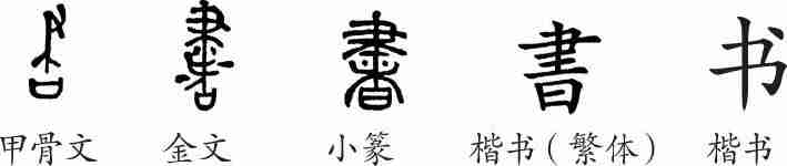 “书”本为会意字。甲骨文会手执笔书写之意。金文变成了从聿、者声的形声字。小篆与金文基本相似。隶变后楷书写作“書”。汉字简化后写作“书”。