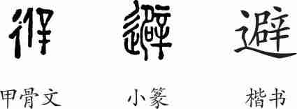 “避”是会意兼形声字。甲骨文从彳,从人,从辛(刑刀),会人逃避刑罚之意。小篆将“彳”换成了“辶”,其意义不变,辟表声。隶变后楷书写作“避”。