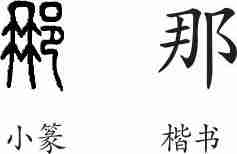 “那”是会意兼形声字。小篆从冄(冉,这里表示胡须)从邑(右阝),会人多长毛发的西部国邑之意。冄,也兼表声。隶变后楷书写作“那”。