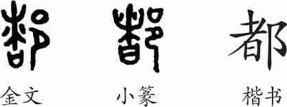 “都”是形声字。金文从邑,者声。隶变后楷书写作“都”。