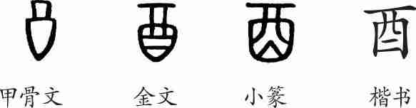 《说文·酉部》:“酉,就也。八月,黍成,可为酎酒。像古文酉之形。凡酉之属皆从酉。”(酉,成熟。(酉)代表八月,这时黍成熟,可以酿制醇酒。像古文“酉”的样子。大凡酉的部属都从酉。)