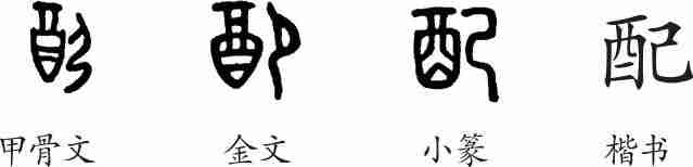 “配”是会意兼形声字。甲骨文从跪坐之女,从酉(酒器),会置酒相对、成礼婚配之意。小篆改为从酉从己会意,己兼表声。隶变后楷书写作“配”。