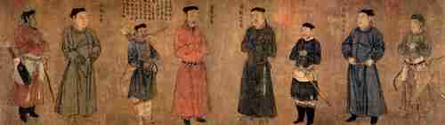 南宋中兴四将图卷(绢本设色,南宋刘松年作)。画中人物为岳飞(左二)、张俊(左四)、韩世忠(右四)、刘光世(右二),其余为侍从。