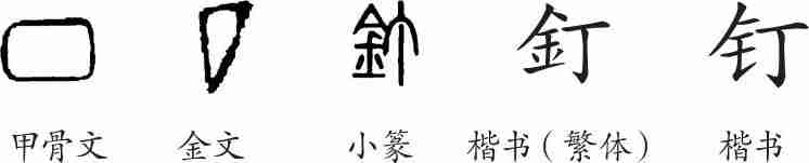 “钉”是会意兼形声字。甲骨文、金文像钉子的俯视和侧视之形。小篆改为从金从丁会意,丁兼表声。隶变后楷书写作“釘”。汉字简化后写作“钉”。