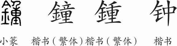 “钟”是形声字。小篆有两个来源:一个从金,童声,表示响器;一个从金,重声,表示容器。隶变后楷书分别写作“鐘”和“鍾”。汉字简化后写作“钟”。