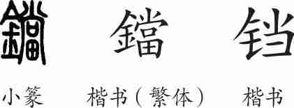 还读作dānɡ,用在“锒铛”中,指锁系囚人的刑具铁锁链。如“锒铛入狱”。由链子引申指女子的耳饰。用作象声词,指打击金属发出的声音。