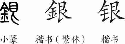 “银”是形声字。小篆从金,艮声。隶变后楷书写作“銀”。汉字简化后写作“银”。