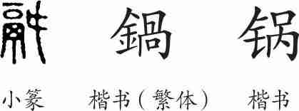 “锅”是形声字。小篆从鬲,声。隶变后楷书写作“鍋”,从金,咼声。汉字简化后写作“锅”。