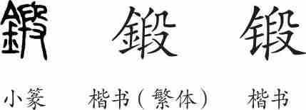“锻”是会意兼形声字。小篆从金从段会意,段兼表声。隶变后楷书写作“鍛”。汉字简化后写作“锻”。