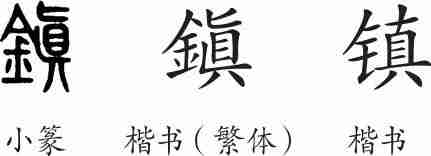 “镇”是形声字。小篆从金,眞声。隶变后楷书写作“鎭”。汉字简化后写作“镇”。
