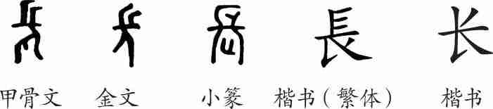“长”是象形字。甲骨文像一位老人拄杖而立之形。隶变后楷书写作“長”。汉字简化后写作“长”。