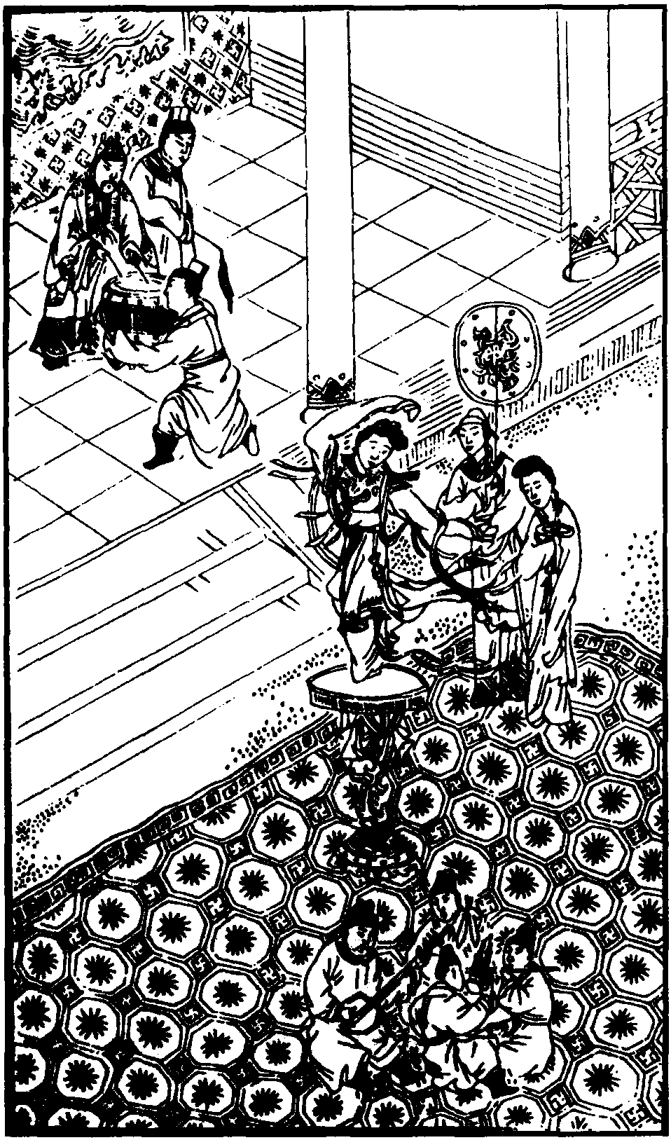 (生)妃子所言,曲尽歌舞之蕴。(旦) 妾制有翠盘一面,请试舞其中,以博天颜一笑。(场上设翠盘,旦花冠、白绣袍、璎珞、锦云肩、翠袖、大红舞裙,旦立盘中舞,丑跪捧鼓,生上坐击鼓,众在场内打细十番合介)