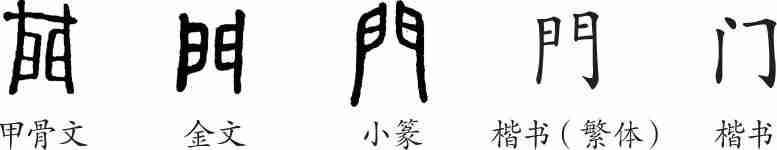 “门”是象形字。甲骨文上部是一条嵌入门枢的横木,下部像两扇门。金文去掉了门楣。小篆承接金文。隶变后楷书写作“門”。汉字简化后写作“门”。