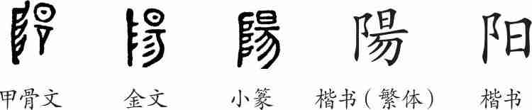 “阳”是会意字。甲骨文像太阳升到了祭神的石桌上方。金文加“彡”表示阳光。隶变后楷书写作“陽”。汉字简化后写作“阳”。