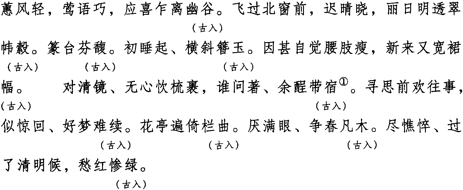 注:一、本词例押古入声“屋” “沃” 韵。因 “屋” “沃” 在古韵中与 “木”“束” 同韵,而“木” “束”在现代韵中属“姑”韵,故全调可押姑部“姑” 韵。