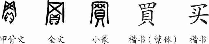 《说文·贝部》:“買,市也。从网、貝。如《孟子》曰:‘登垄断而网市利。’”(買,购进。由网、貝会意。《孟子》说:“登上独立的高地(窥视),(企图)网罗买卖的好处。”)
