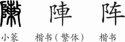 “阵”是会意兼形声字。楷书繁体写作“陣”,从车,从陳省,会陈列之意,陳兼表声。汉字简化后写作“阵”。