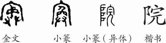 “院”是形声字。金文从宀,奐声。小篆整齐化;异体从(左阝),完声。隶变后楷书写作“院”。
