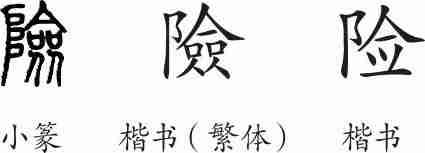 “险”是形声字。小篆从(左阝,表示山),僉声。隶变后楷书写作“險”。汉字简化后写作“险”。
