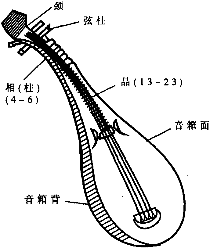 “琵琶”,本作“批把”。拨弦乐器。汉·刘熙《释名·释乐器》云:“批把本出于胡中,马上所鼓也。推手曰批,引手却曰把,像其鼓时,因以为名也。”它原有各种形制,宋以前统称“琵琶”。唐宋以后,逐渐形成现今形制,如下图——