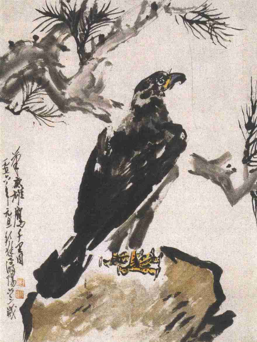 在着力画了主体的雄鹰之后,画家表现山冈和松枝的用笔便更趋自如。那山冈,不过是勾廓略皴几笔便已意足——因画鹰的笔墨紧密,鹰与石的繁简应拉开距离;而松枝与稀疏的松针则以淡墨逸笔草草,这与笔墨浓重、相对谨严的鹰也恰成对照。在章法上注意了繁简收放的变化之外,画家还有意使下面山冈的笔势成上耸之态,上面的松枝则穿插横斜,从而使画面空间更显收放开张,使雄鹰的屹立之势平中寓奇。