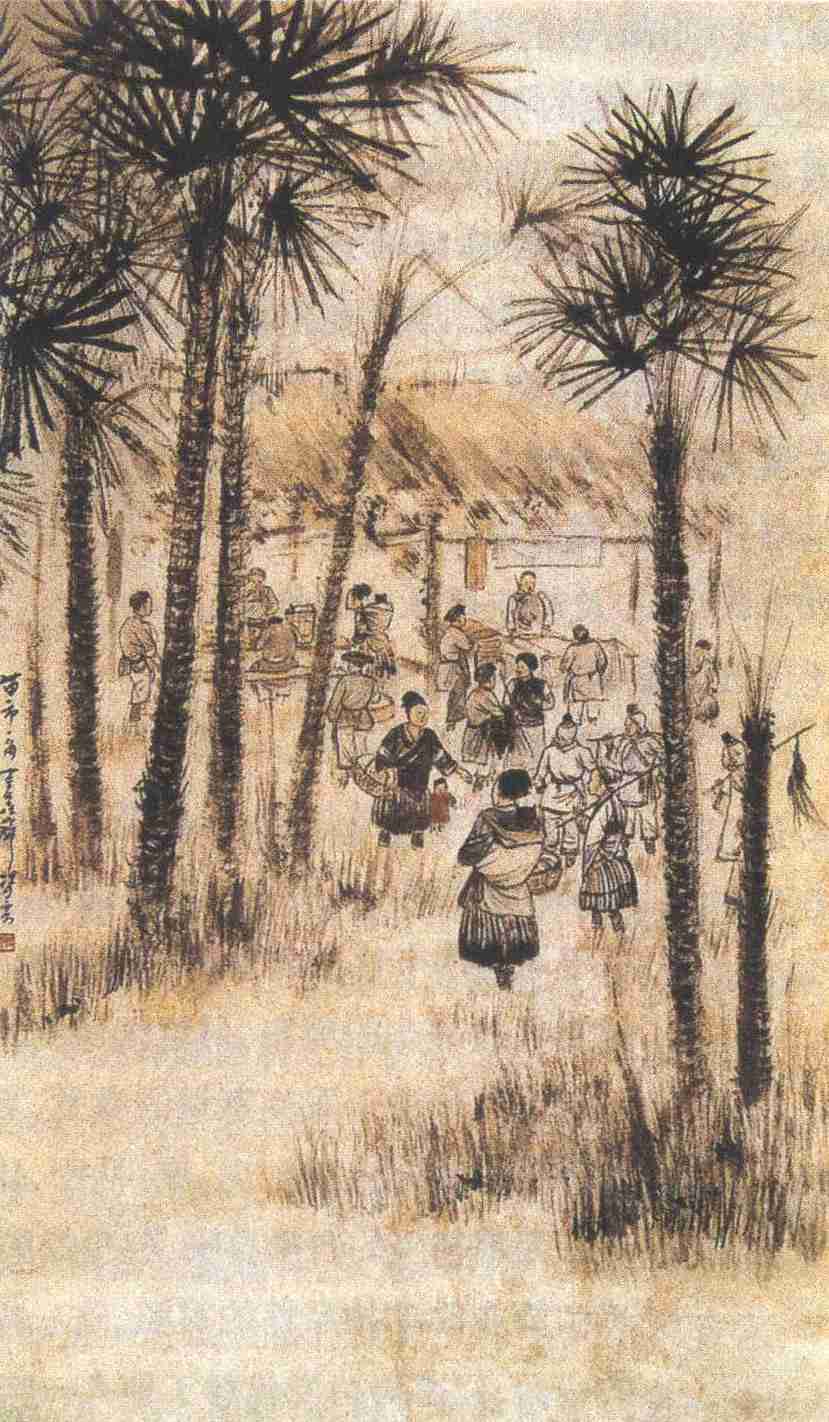在画面的组构上,画家采取下虚上实的手法,下端几近三分之一的画面空白与直挺粗浑的棕榈树,将观者的视线导入画面的中心,简括的茅店与精绘的人物对比,显示了画家对客体把握的驾轻就熟。直白地说,此画的重点是人物活动,茅店、草木只是衬托物,但是衬托物决非可有可无,无足轻重,它与人物是绿叶与红花的关系,倘若绿叶凋败枯槁,红花势必减色失鲜,难以显露姿色。