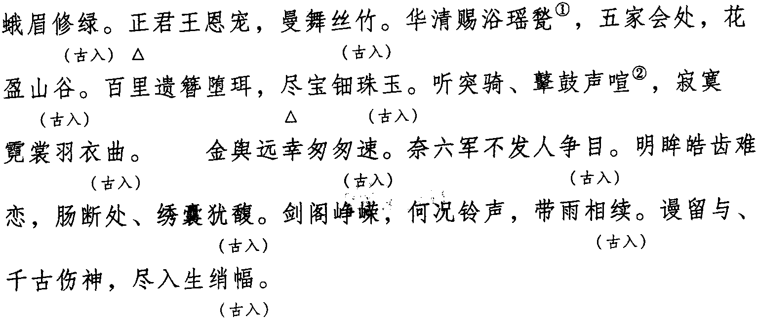 注:一、本词例押古入声“屋”“沃”韵。因“屋” “沃”在古韵中与“束”“木”同韵,而“束”“木”在现代韵中属“姑”韵。故全调可押姑部“姑”韵。