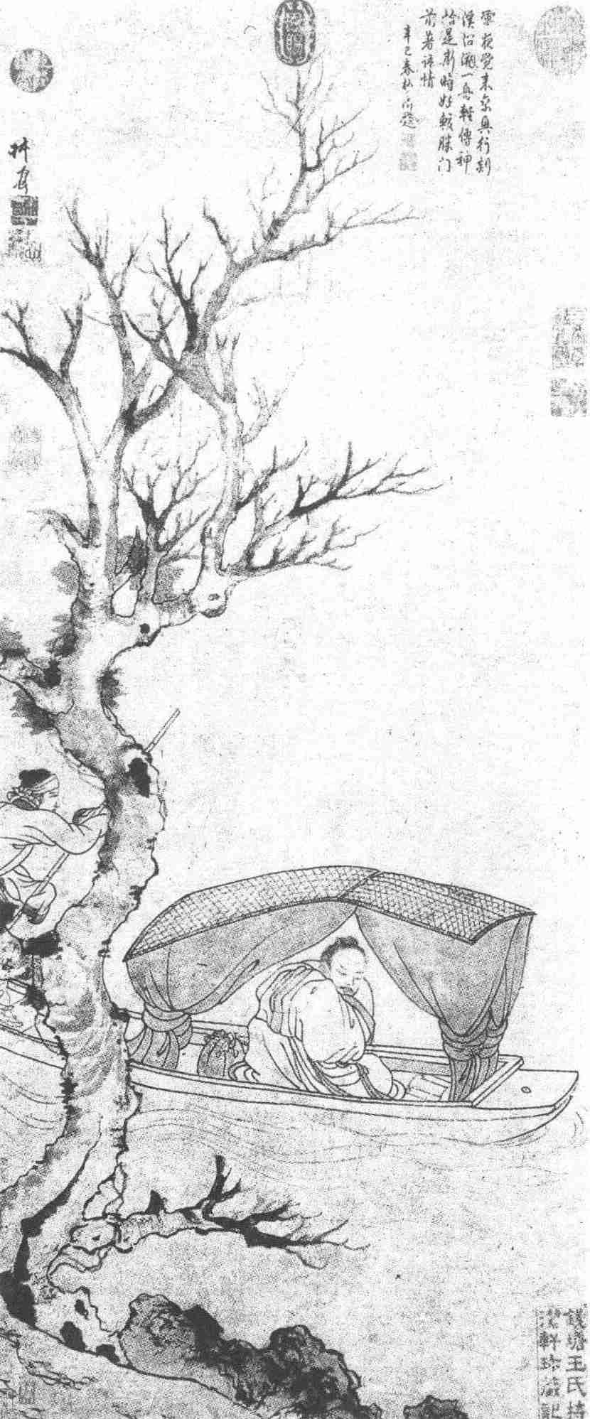 只见山溪雪后,溪岸老树槎枒,木叶尽脱,白雪烂然,寒风凛冽。画面中心是一艘小船,船艄上童子使劲地撑着竹篙,小船慢慢地离岸启航。徽之坐在船舱里,左右两旁放着包袱和书卷,双手缩在衣袖里作打拱状,似在默默地遥向戴逵“告别”。作者选择了这个有趣故事的重要环节加以刻画是别具匠心的。