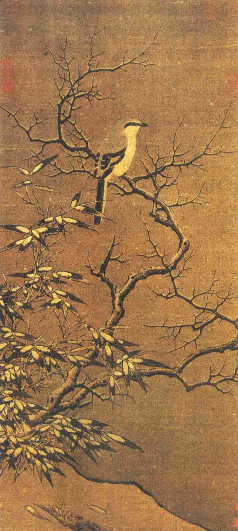 在意境的塑造上,画家着意渲染冬季寒冷肃寂的气氛,然而在静寂中又透出自然界生命的活力,那伯劳鸟稚弱的生命令人怜爱,雪竹的凌寒不凋显示着一种生生不息的力量。清吴其贞在《书画记》里称赞此画“精俊如生,气韵绝伦”,也是为作品流露的生机所感动。